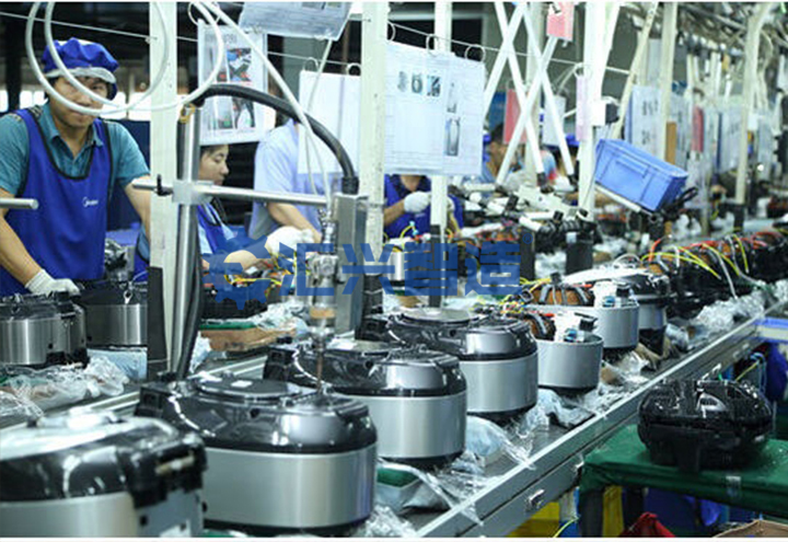 匯興智造電飯煲整廠自動化生產線是由各式差速鏈裝配檢測線、懸掛輸送裝配線、輥道輸送裝配線、鏈板式電機浸漆線、電飯煲測試檢測線組成,另外包括自動噴涂設備、頂升平移機、打包機等各類專機設備,共同完成電飯煲的生產任務。