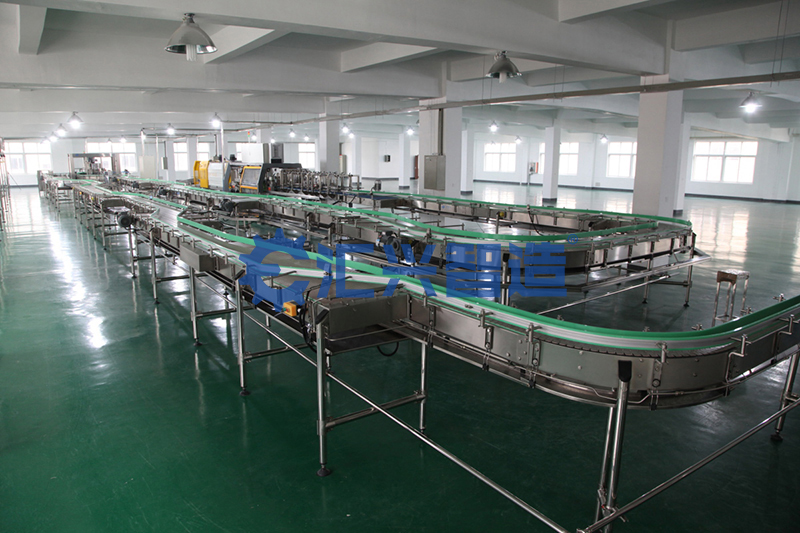 鏈板輸送線以標準鏈板為承載面,由馬達減速機為動力傳動;我們可以通過多列鏈板并行,使鏈板輸送線做的很寬并形成差速,利用多列鏈板的速度差使多列輸送在無擠壓的情況下變為單列輸送,從而滿足飲料貼標、灌裝、清洗等設備的單列輸送的要求,同樣也可以使單列變成多列并行走緩慢,從而產生儲存量,滿足殺菌機、儲瓶臺、冷瓶機的大量供料的要求,我們可以將兩條鏈板輸送線的頭尾部做成重疊式的混合鏈使得瓶(罐)體處于動態過度狀態,使輸送線上不滯留物料,可以滿足空瓶以及實瓶壓力和無壓力輸送。