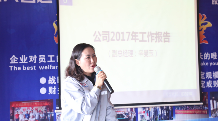 匯興智造副總經理辛曼玉以一句“2017,您幸福嗎?”開啟大會的第六項議程,作2017年年度工作報告。辛副總說:“在2017年,匯興智造實現了16年來都沒有實現的銷售業績;成立了研究院、技術研究中心等研發機構,公司的研發能力得到提高;調整了產品結構,拓展了行業范圍,并且守護住了傳統行業,夯實了業績;實現了配件事業的業績倍增,取得喜人成績;加強了人力資源建設,老員工在進步,能力在提升,而高學歷、高層次員工的加盟,讓匯興智造如虎添翼。這一年,雖然我們經歷了困難、挫折,但取得的成績是驕人的。匯興智造在往前走,往上走,我們在上坡的過程中,會氣喘,會腿酸,很累,但當我們爬上山頂的時候,那種‘會當凌絕頂,一覽眾山小’的豪情和喜悅卻是無法比擬的。所以,如果有人問:2017,您幸福嗎?我會回答:我很幸福!”
