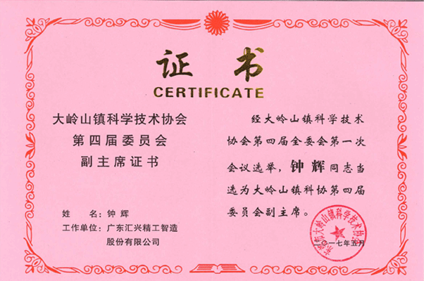 匯興智造鐘董任命大嶺山鎮(zhèn)科學(xué)技術(shù)協(xié)會(huì)副主席證書