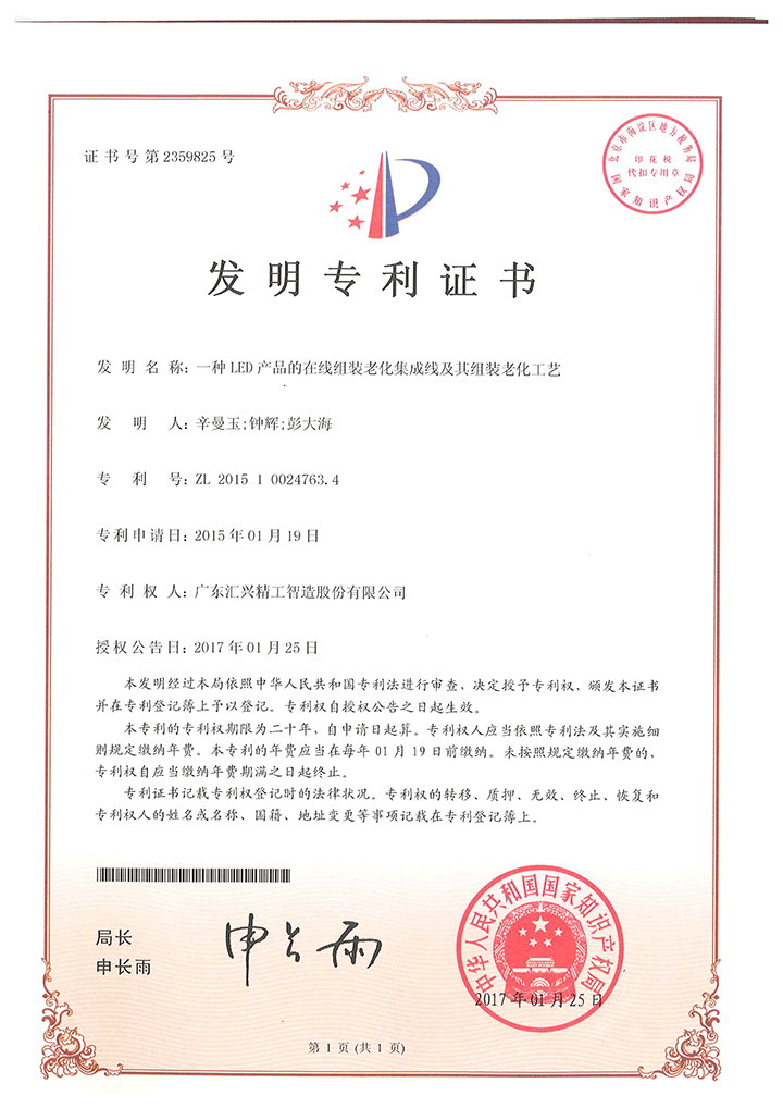 《一種LED產品的在線組裝老化集成線及其組裝老化工藝》發明專利證書