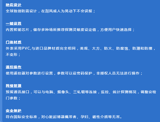 該設備采用世界先進的電磁兼容設計和抗震動設計,具有超高靈敏度、極強的抗干擾能力和抗震能力,適用于管制刀具和槍支等危險物品的安全檢查,廣泛應用于監獄、法院、學校、醫院、電子企業、港口、客運站、展覽會館、會議中心、重大慶典、演唱會等重要場所。