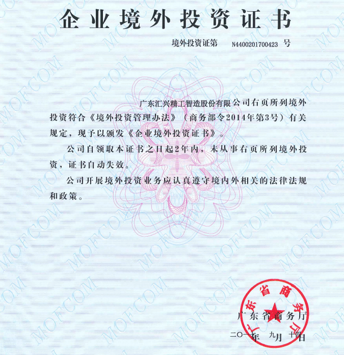 2017年8月29日,廣東匯興精工智造股份有限公司(股票代碼:839258)正式獲得企業(yè)對(duì)外投資證書(shū)。匯興智造赴德設(shè)立......